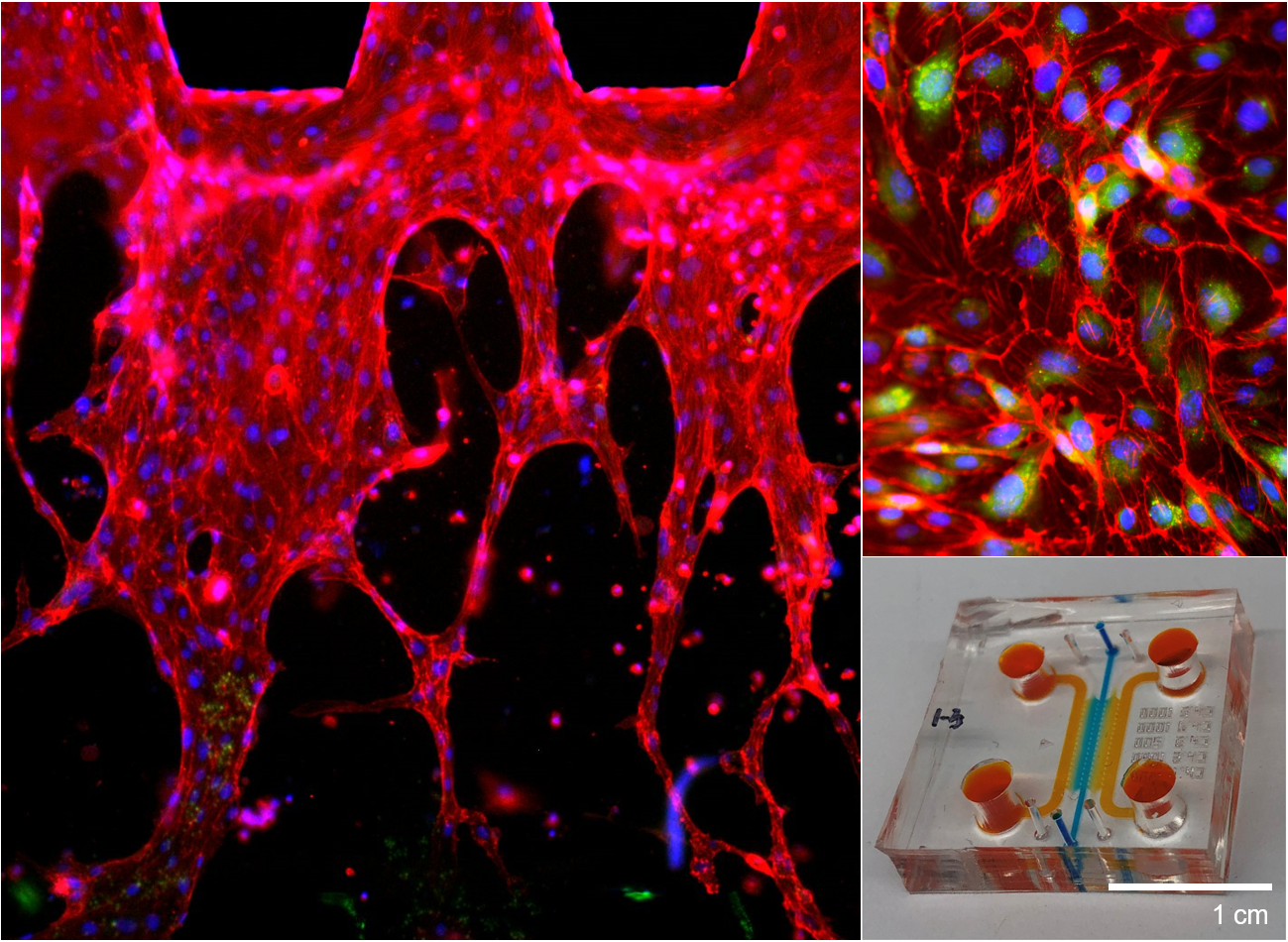 We design and tune 3D composite scaffolds to provide an optimal microenvironment for encapsulated cells to differentiate into a specific direction and develop tissue. By orchestrating different types of cells, we can control the spatial distribution of cellular structure in 3D tissue scaffold. As blood circulation is critical during tissue regeneration by supplying oxygen, nutrients, and cells, we have also successfully recapitulated perfusable microvasculature in 3D tissue scaffolds. We have engineered vascularized tissues on microfluidic chips, which can be used for testing novel drugs and investigating pathological mechanisms of various diseases, including cancer metastasis. Since each tissue dynamically interacts with other neighboring tissues, we have been using a holistic and interdisciplinary approach to engineer complex organ systems, including the usage of 3D bioprinting technology. At the same time, we regulate different types of biomaterials for directing cellular growth and differentiation as cells of each tissue type seek their niche with distinct physicochemical properties.